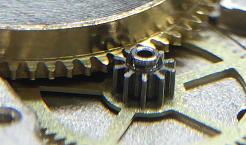 経年劣化による機械の汚れ、及び油が完全に乾いてしまっています。風防交換 プラスチックのこの年代特有の「風防」と云われるもので、当時は修理の度に交換が必須でした。